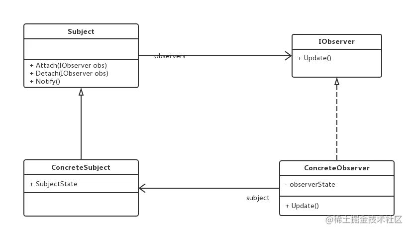 (3)Observer(抽象观察者):观察者将对观察目标的改变做出反应。