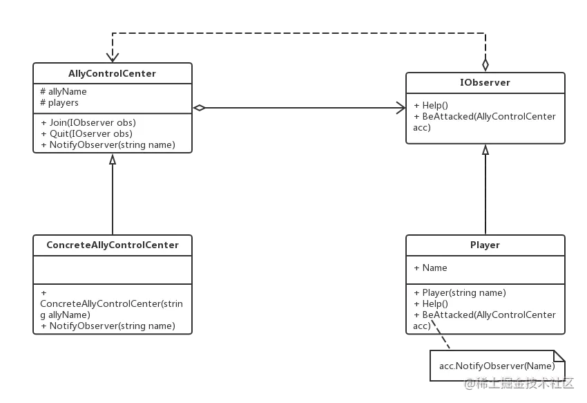 其中,AllyControlCenter充当抽象目标,ConcreteAllyControlCenter则充当具体目标,IObserver充当抽象观察者,Player则充当具体观察者。