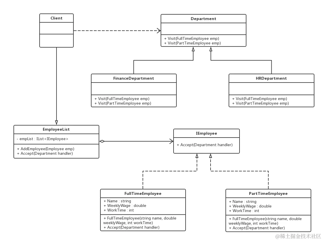 但是,如果我们要在系统中新增具体元素,比如新增一个新的员工类型为“退休人员”,由于原系统并未提供相应的访问接口,因此必须对原有系统进行修改。所以,从新增新的元素来看,访问者模式违背了开闭原则。