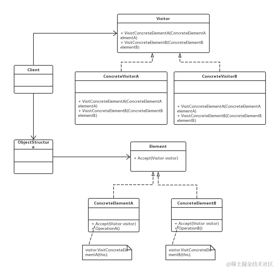 因此,访问者模式与抽象工厂模式类似,对于开闭原则的支持具有“倾斜”性,可以方便地新增访问者,但是添加新的元素较为麻烦。