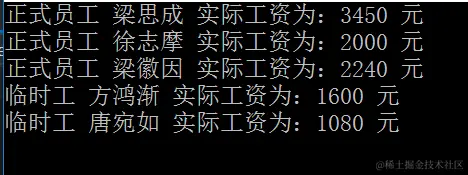 Console.WriteLine("正式员工 {0} 实际工资为:{1} 元", employee.Name, weekWage);