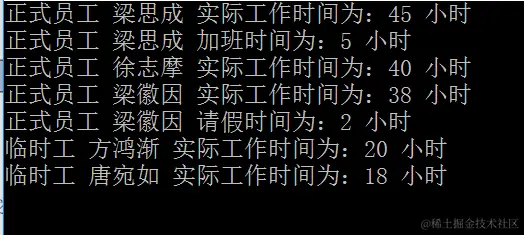 Console.WriteLine("正式员工 {0} 实际工作时间为:{1} 小时", employee.Name, workTime);