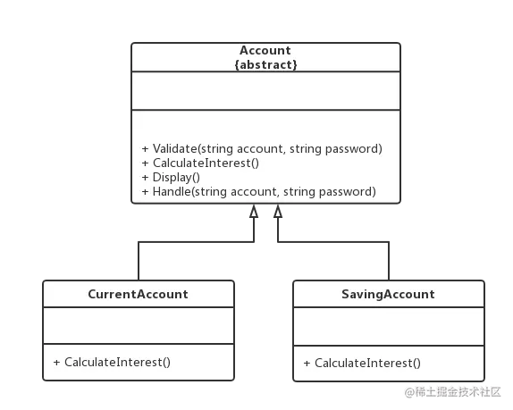 (2)客户端需要逐个调用Account类中定义的方法,而且需要了解这些方法的执行与否,否则容易出错 => 例如Account类中的3个方法的次序为:Validate() => CalculateInterest() => Display(),如果不按次序调用,可能会导致结果出错。