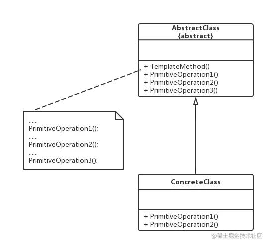 (2)ConcreteClass(具体子类):抽象类的子类,用于实现在父类中声明的抽象基本操作以完成子类特定算法的步骤,也可以覆盖在父类中已经实现的具体基本操作。