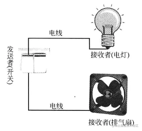 在生活中,我们装修新房的最后几道工序之一是安装插座和开关,通过开关可以控制一些电器的打开和关闭,例如电灯或换气扇。在购买开关时,用户并不知道它将来到底用于控制什么电器,也就是说,开关与电灯、换气扇并无直接关系,一个开关在安装之后可能用来控制电灯,也可能用来控制换气扇或者其他电器设备。相同的开关可以通过不同的电线来控制不同的电器,如下图所示。