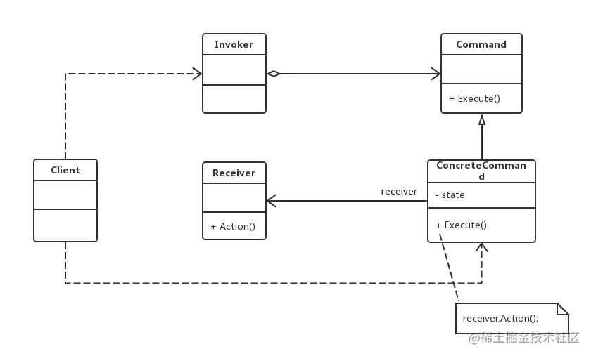 命令模式的核心在于引入了命令类,通过命令类来降低请求发送者和接收者的耦合度,请求发送者只需要指定一个命令对象,再通过命令对象来调用请求接收者的处理方法,其结构如下图所示。
