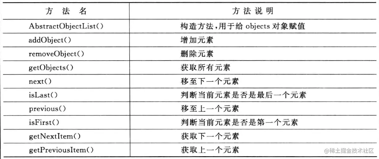 (3)如果将所有的遍历操作都交给子类来实现,将导致子类代码过于庞大,而且必须暴露AbstractObjectList类的内部存储细节,向子类公开自己的私有属性,否则子类无法实施对数据的遍历,将破坏AbstractObjectList类的封装性。