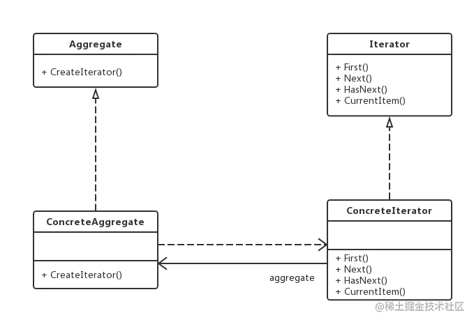 (3)Aggregate(抽象聚合类):用于存储和管理元素对象,声明一个CreateIterator()方法用于创建一个迭代器对象,充当抽象迭代器工厂角色。