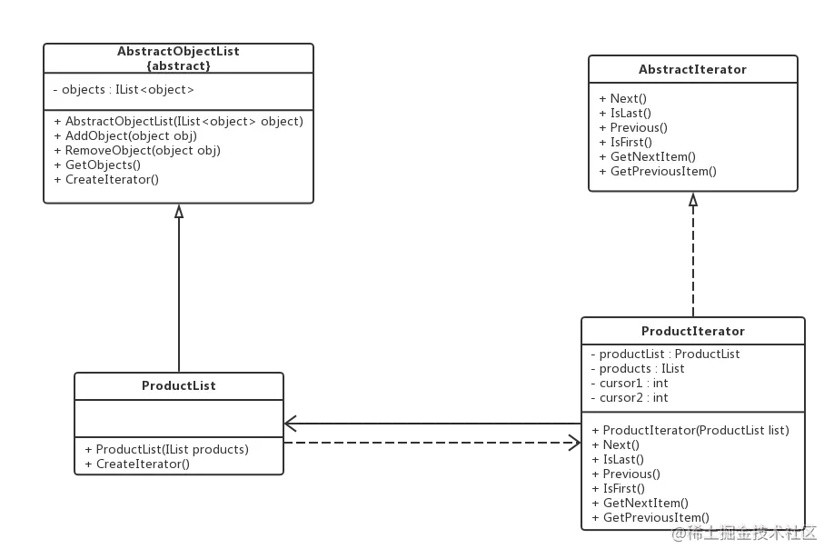 其中,AbstractObjectList充当抽象聚合类,ProductList充当具体聚合类,AbstractIterator充当抽象迭代器,ProductIterator充当具体迭代器。