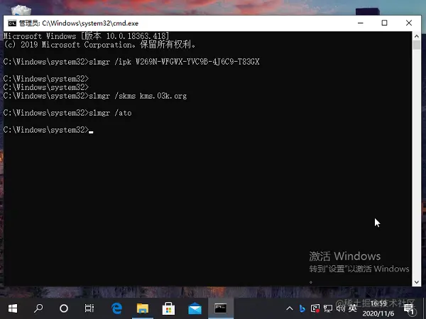 2、再输入 slmgr /skms kms.03k.org 然后按回车即可。