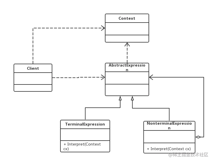 (1)AbstractExpression(抽象表达式):声明了抽象的解释操作;