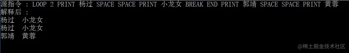 Background:M公司开发了一套简单的基于字符界面的格式化指令,可以根据输入的指令在字符界面输出一些格式化内容,例如输入“LOOP 2 PRINT 杨过 SPACE SPACE PRINT 小龙女 BREAK END PRINT 郭靖 SPACE SPACE PRINT 黄蓉”,将输出以下结果: