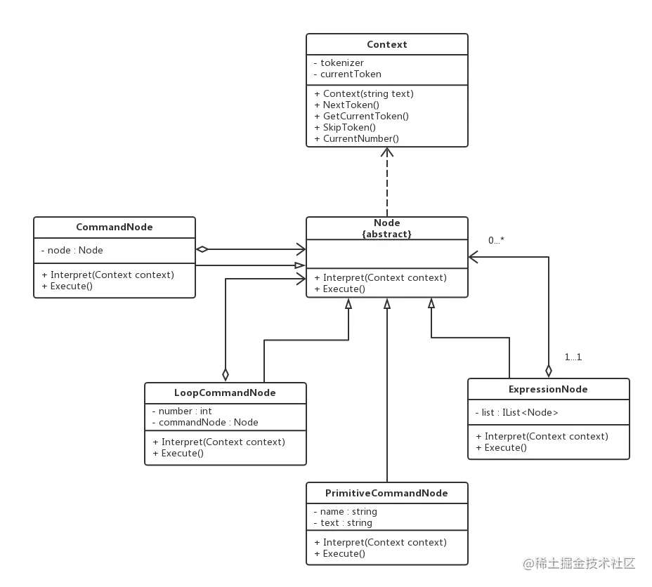 其中,Context充当环境类角色,Node充当抽象表达式角色,ExpressionNode、CommandNode和LoopCommandNode充当非终结符表达式角色,PrimitiveCommandNode充当终结符表达式角色。