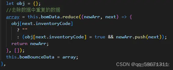 let一个空对象存放数组中需要去重的数据(这里是inventoryCode)。原理就是reduce有累计器累计回调的返回值; 这里的next.inventoryCode第一次为空所以会走true && newArr.push(next),将这个值push到next中(我们这里把这个值记为A),那么在走第二次判断时next.inventoryCode的值为A。最后不重复的值会return出去。