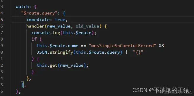 Vue 路由跳转问题(未进行跳转但是会触发方法) 汪汪队出击 2022-11-03 46 阅读1分钟 本文已参与「新人创作礼」活动,- 起开启掘金创作之路。 问题: 未触发事件进行路由跳转到当前页面,但watch会监听到所有的路由变化,因此会掉handeler下面的 get()方法导致报错。 解决: 判断是否路径或者name是否是当前页面且判断路由传参是否有值(parms传参就判断parms,query传参就判断query)