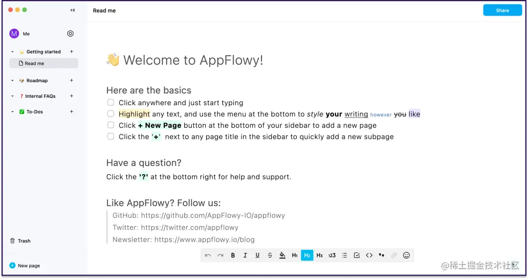 虽然 AppFlowy 自称是 Notion 的开源替代品,但老实说,这个项目功能还不够很强大。虽然它的基础编辑功能没有什么问题,但是整体上距离 Notion 还有一定的距离。