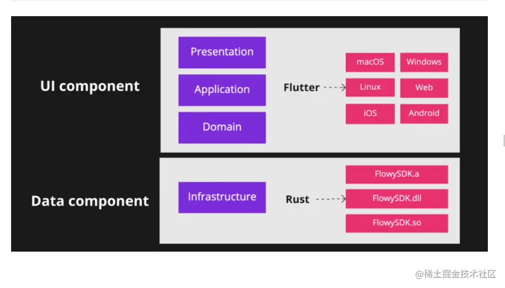 具体说,AppFlowy 的前端架构分层为两大部分:即基于 Flutter 实现的UI 组件 部分,及 基于 Rust 实现的 数据组件 部分。