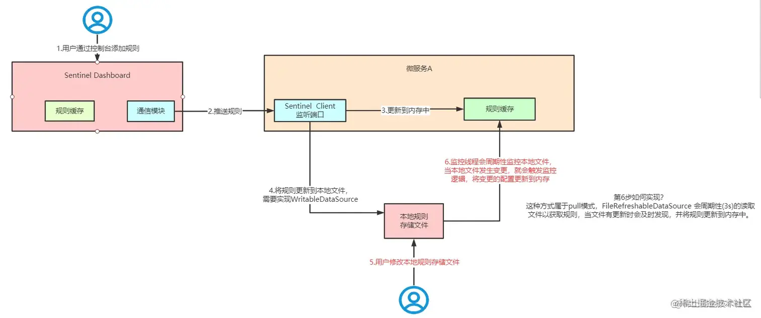 首先 Sentinel 控制台通过 API 将规则推送至客户端并更新到内存中,接着注册的写数据源会将新的规则保存到本地的文件中。使用 pull 模式的数据源时一般不需要对 Sentinel 控制台进行改造。这种实现方法好处是简单,坏处是无法保证监控数据的一致性。