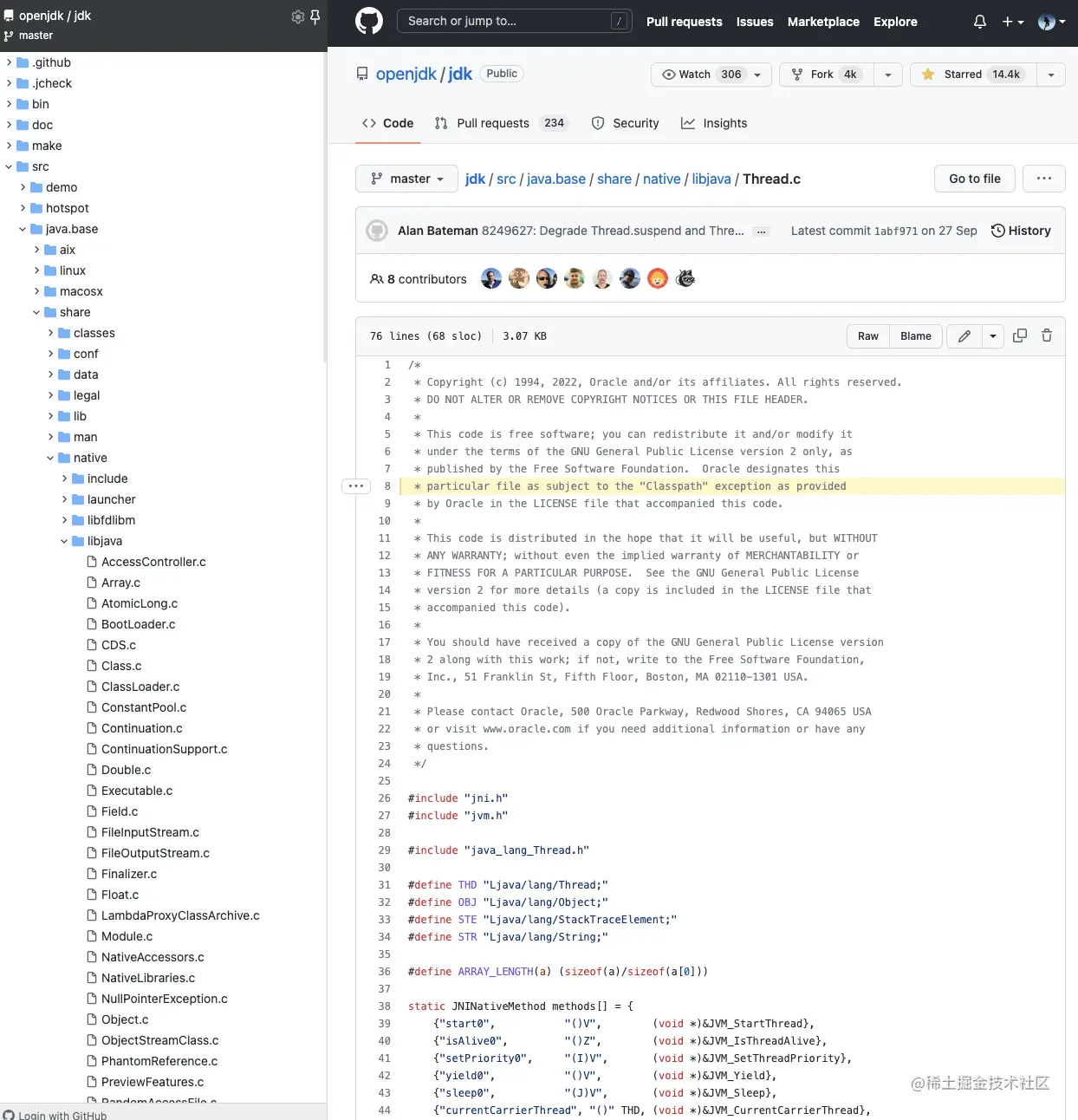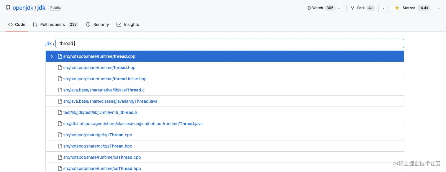 通过查看 JDK 8 和 JDK 19 的 Thread 源码,可以发现里面的实现已经大不一样了。对于 Thread 这块又涉及大量的操作系统底层接口,最好能直接看 JDK 源码。其实有一个完全不用下载,不用配置环境查看底层源码的方法,那就是使用 Github~~~