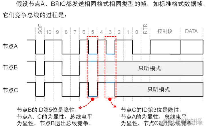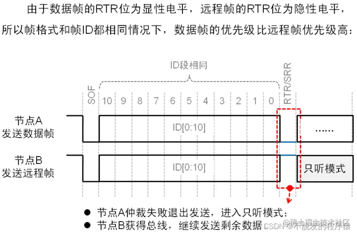 数据帧和遥控帧的仲裁过程如下图所示: