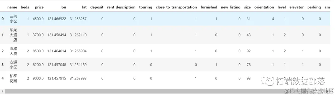 此数据来自 Lianjia.com.csv文件包含名称,租赁类型,床位数量,价格,经度,纬度,阳台,押金,公寓,描述,旅游,交通,独立浴室,家具,新房源,大小,方向,堤坝,电梯,停车场和便利设施信息。