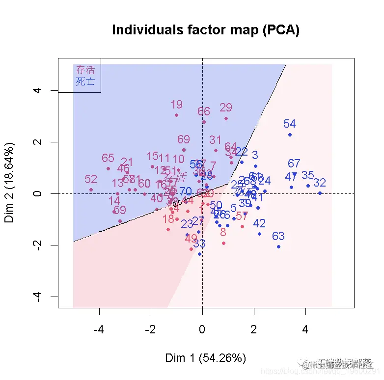 结果不错,我们看到因变量与部分自变量是同向的。也可以可视化样本和类别