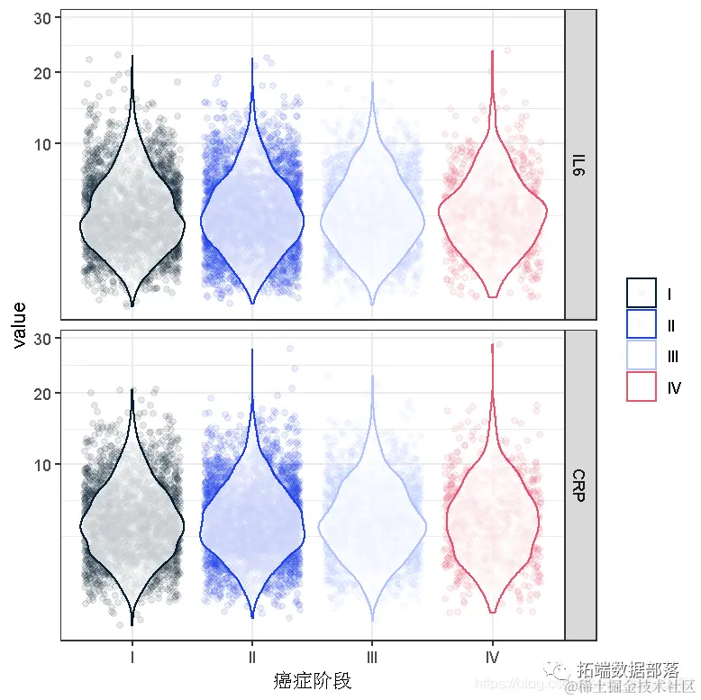 因为IL6和CRP都有偏斜分布的倾向,所以我们在Y轴上使用了平方根刻度。分布看起来相当正常和对称,你仍然可以看到长的右尾,即使使用了平方根刻度(注意,只有刻度被转移,数值本身没有被转换,这很重要,因为这让你看到并解释实际的分数,而不是分数的平方根)。