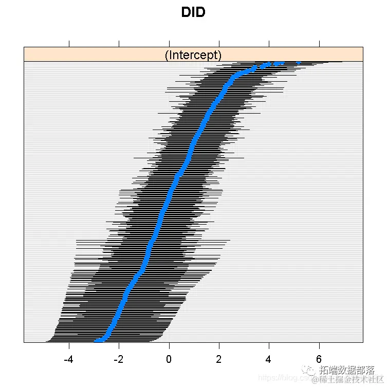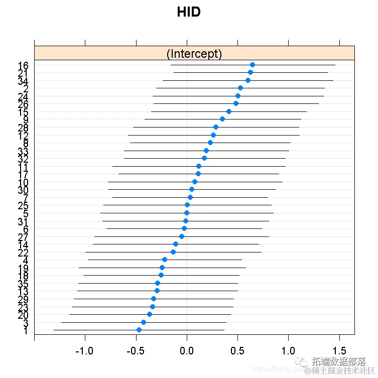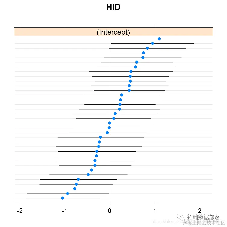 看一下条件模型的分布也是很有用的,下面我们用“毛毛虫图”来做。蓝点是带有误差条的条件模型。我们对医生和医院都是这样做的。例如,对于医生来说,我们可以看到一个有点长的右尾,即极端的正值比负值多。