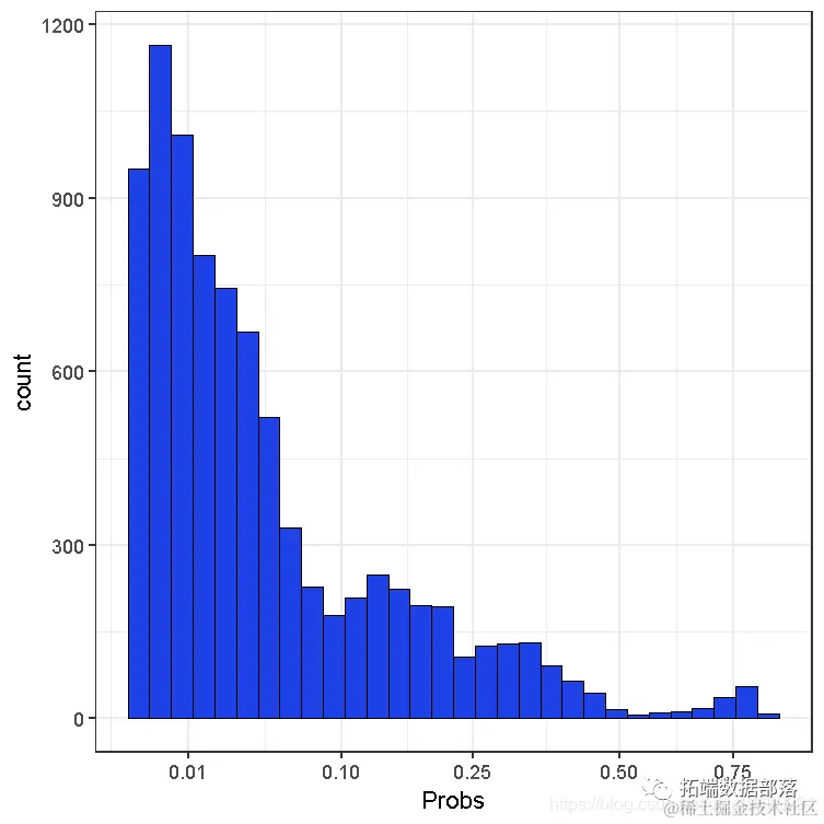 即使使用平方根尺度,将较低的数值拉长,它仍然是极其偏斜的。据估计,绝大多数人的病情缓解的概率不到0.1。