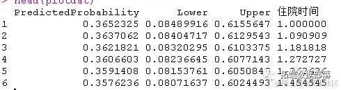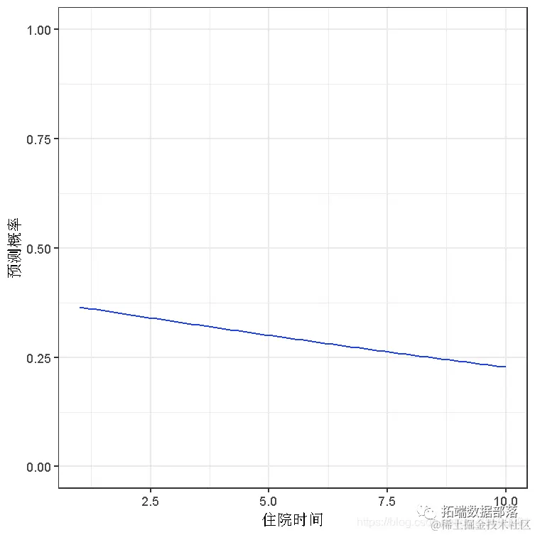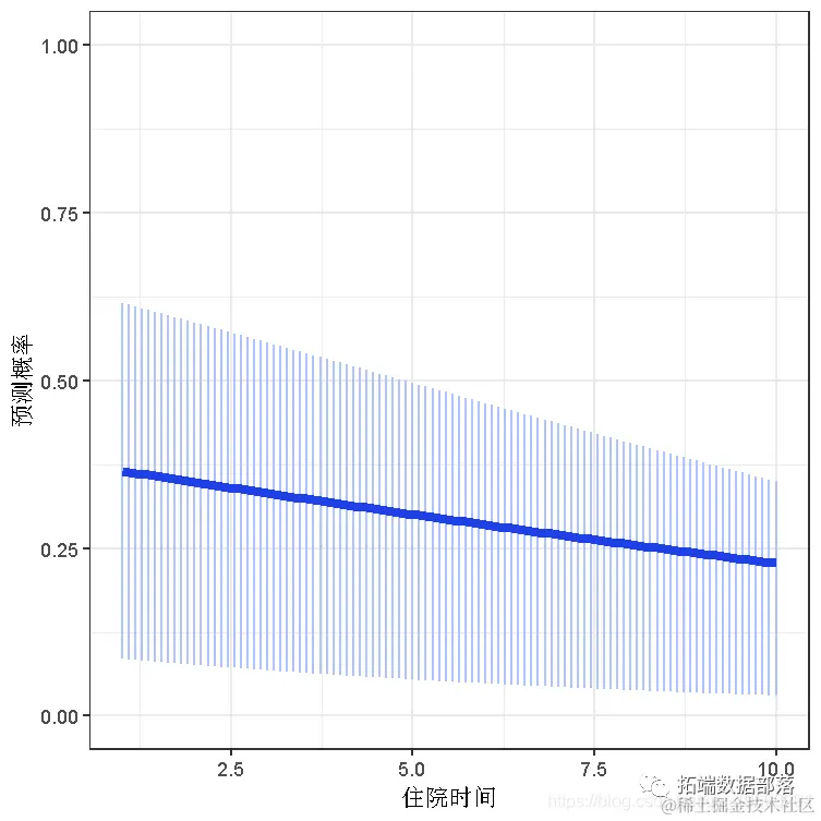 现在我们有了一些背景和理论,我们看看如何实际去计算这些东西。我们得到一个住院时间(我们感兴趣的预测因子)的摘要,然后在其范围内得到100个值,用于预测。我们复制一份数据,这样我们就可以固定其中一个预测因子的值,然后使用预测函数来计算预测值。默认情况下,所有的随机效应都被包括在内。