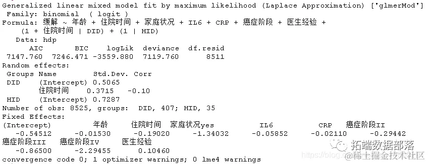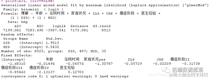 第一部分告诉我们,估计值是基于自适应高斯-赫米特的似然性近似。为了避免出现不收敛的警告,我们用参数control=glmerControl(optimizer="bobyqa")指定不同的优化器。