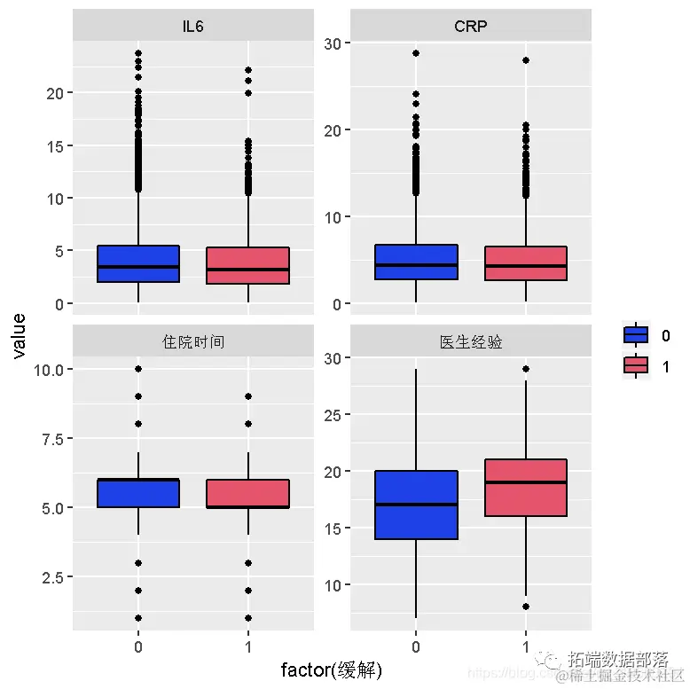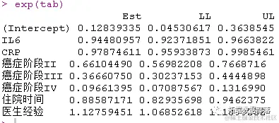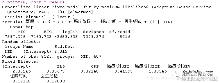 下面我们使用glmer命令估计混合效应逻辑回归模型,Il6、CRP和住院时间为患者水平的连续预测因素,癌症阶段为患者水平的分类预测因素(I、II、III或IV),经验为医生水平的连续预测因素,还有DID的随机截距,医生ID。