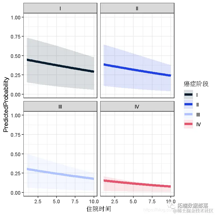 除了改变住院时间之外,我们还可以对癌症阶段的每一级做同样的平均边际预测概率。