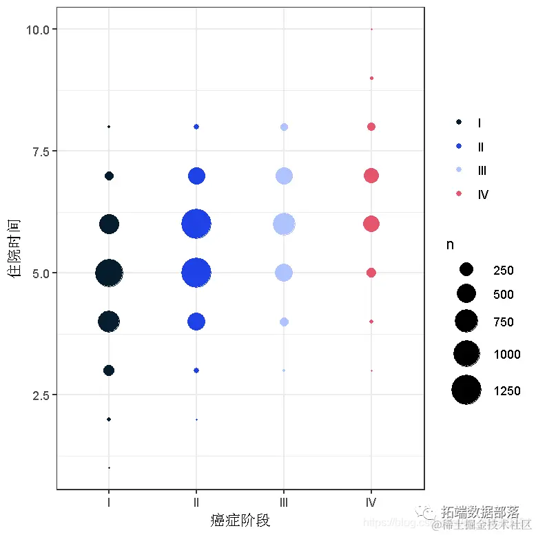 我们的连续预测因子之间似乎没有强的线性关系。让我们看看我们的变量在癌症阶段中的分布情况。因为住院时间是以天为单位的,我们可以用气泡图来研究癌症阶段与它的关系。每个气泡的面积与具有这些数值的观察值的数量成正比。对于连续的预测因子,我们使用小提琴图。所有的原始数据都按癌症阶段分开显示。