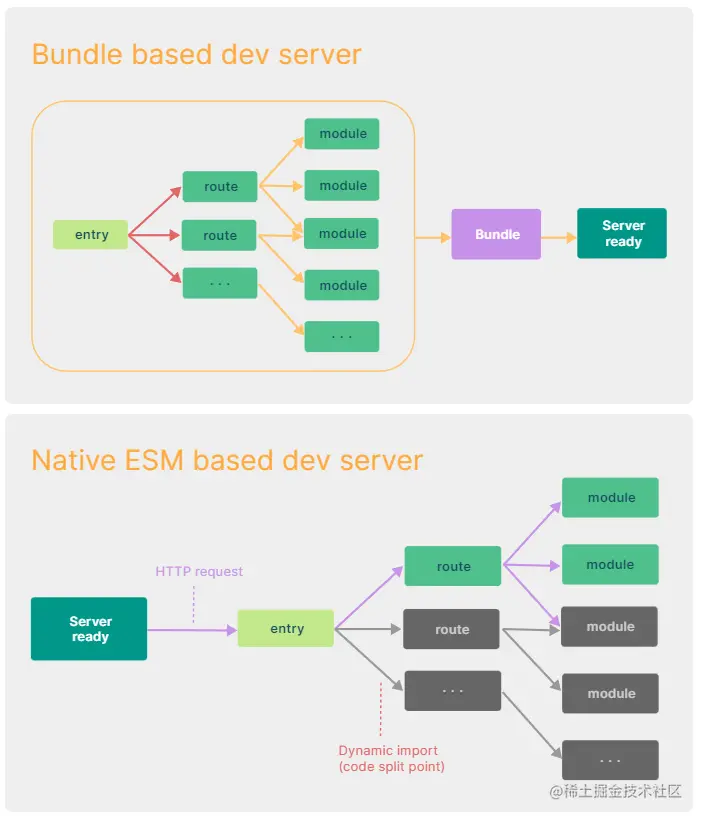 再贴两张大家可能已经很熟的对比图: 相信大家看了上述官网的摘要差不多已经明白为什么vite在开发环境下启动速度非常快的原因了,主要就是使用了浏览器原生支持的