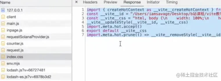 - 将该css文件中的内容直接替换为js脚本(方便热更新或者css模块化), 同时设置Content-Type为js 从而让浏览器以JS脚本的形式来执行该css后缀的文件