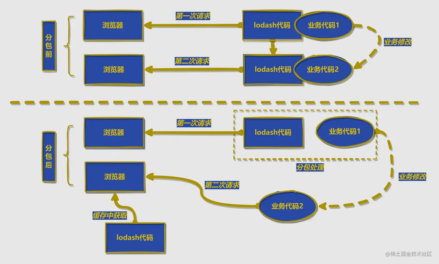 lodash中的forEach函数编写了console('1'),最终打包后的代码如果不分包则会将lodash中的相关实现和console('1')合并为一个文件传给浏览器; - 而我们的业务代码经常变化,比如