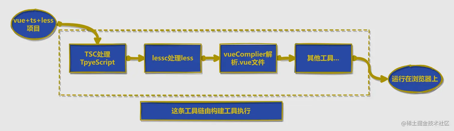 现阶段我们基本都不会直接编写可以浏览器上运行的文件,更多的是使用各种新的框架(Vue/React)、语法(TypeScript/less/sass),用这些工具编写出来的代码时不能直接在浏览器上直接运行的,我们需要每次都手动使用不同的解释器/编译器去将用高级语法编写的代码转换为能在浏览器中运行的代码: 所以简单理解构建工具(打包工具)要做的就是这样一件事:将这条工具链内置,面向开发者透明,避免开发者每次查看效果都要重复机械化地输入不同的命令,除此之外,构建工具还可以使用各种优化工具优化最终生成的文件。 一般来说,一个构建工具会有以下功能: