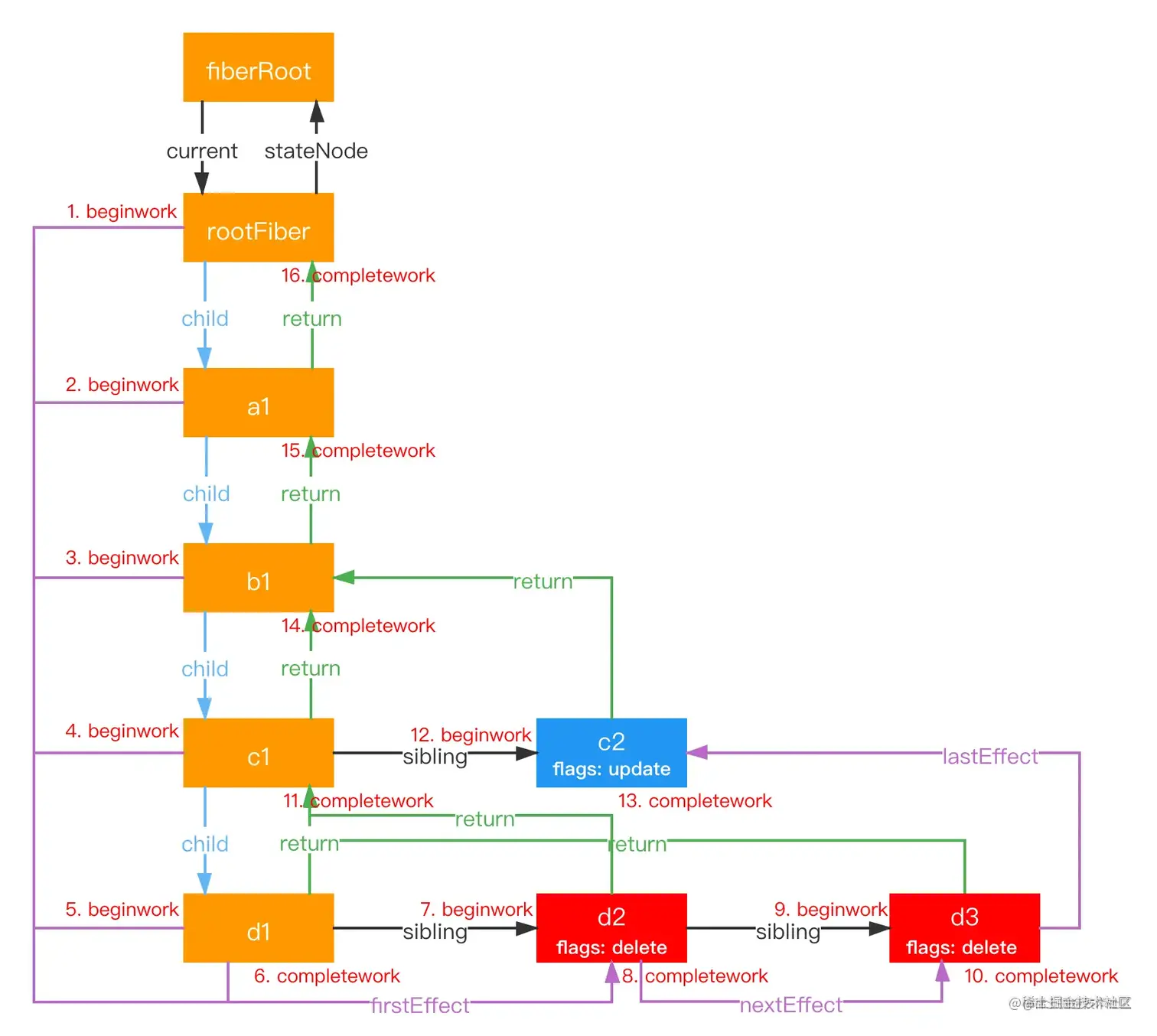 update 时,react 会根据新的 jsx 内容创建新的 workInProgress fiber,还是通过深度优先遍历,对发生改变的 fiber 打上不同的 flags 副作用标签,并通过 firstEffect、nextEffect 等字段形成 Effect List 链表。