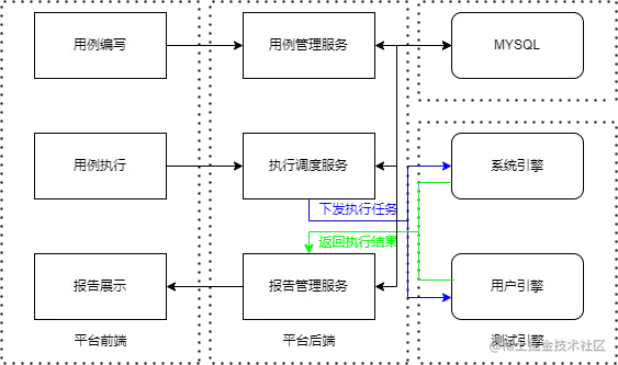项目分为平台端和引擎端,采用分布式执行设计,可以将测试执行的节点(即引擎)注册在任意环境的任意一台机器上,从而突破资源及网络限制。同时,通过将引擎启动在本地PC上,方便用户快速调试测试用例,实时查看执行过程,带来传统脚本编写一致的便捷。