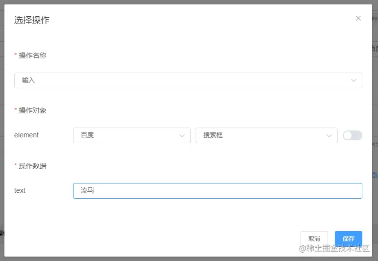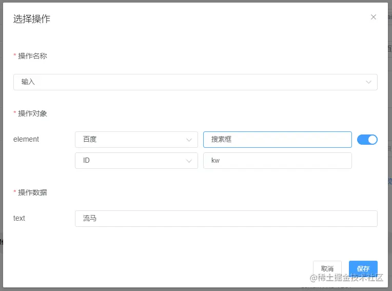 这里有个小点需要特别注意,按照我原本编写测试脚本的固化思维是:先声明元素对象>>再附加元素动作,比如点击、双击、滑动、长按等,所以也想当然地先来添加元素,结果摸索了半天没找到入口。但其实是先选择操作的动作,如输入、单击>>再选择要操作的事先录入好的元素: