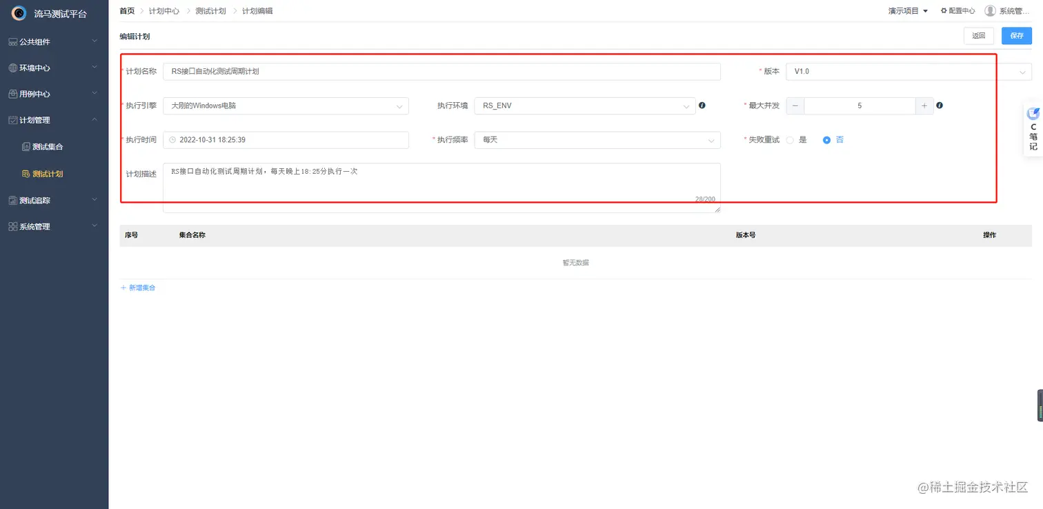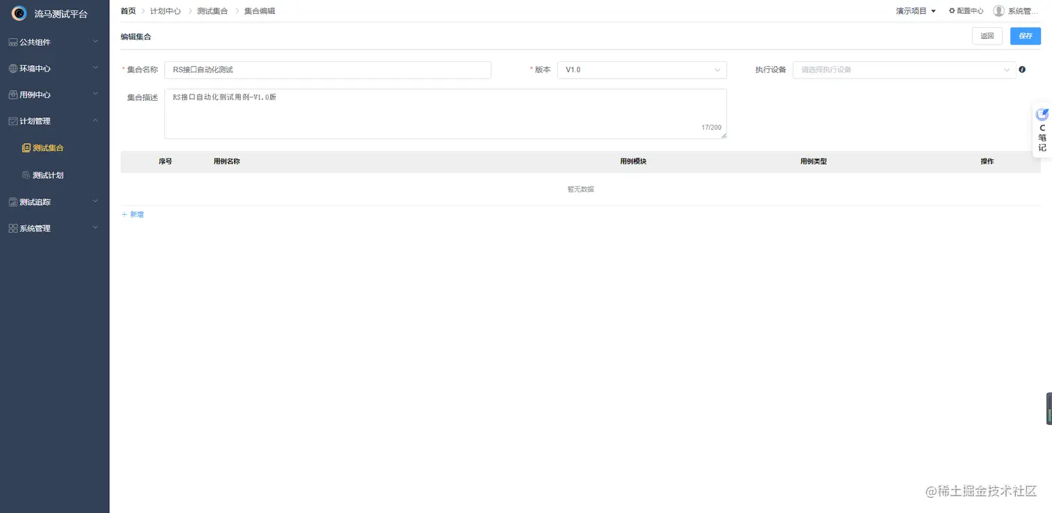 测试集合可以看作是多个测试用例的集合,每条用例相互独立、互不影响。填写集合相关信息,注意版本要在配置中心提前新建好。