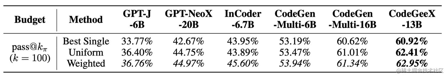 A uniform assignment, e.g., distributing 100 samples to 20*5, can already improve the pass rate by a solid margin. Another heuristic that allocates generation budgets by the proportion of languages in the training corpus is even better, improving the pass@100 of CodeGeeX from 60.92% to 62.95%. All multilingual models benefit from this heuristic, with pass@100 improved by 1~3% against the best single language. CodeGeeX achieves higher performance than baseline models under the above budget-distributed settings.