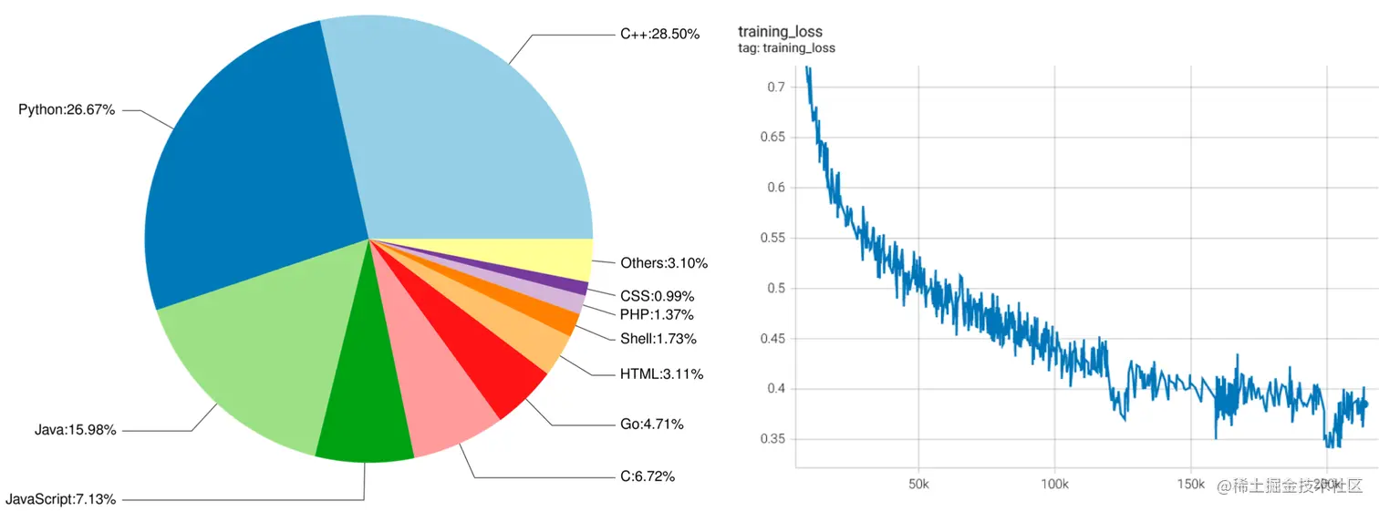 Left: the proportion of programming languages in CodeGeeX's training data. Right: the plot of training loss against the training steps of CodeGeeX.