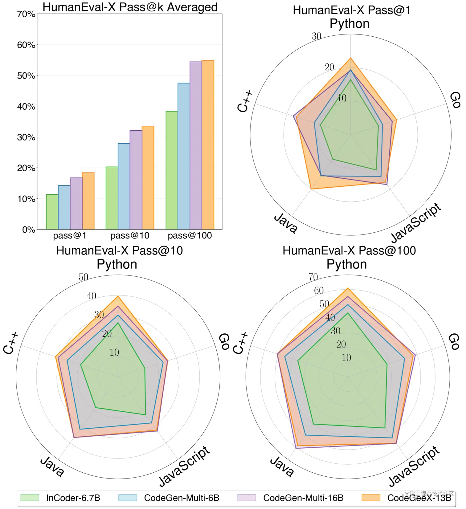 Upper-left: the average performance of all languages of each model on code generation task of HumanEval-X. Others: the detailed pass@k (k=1,10,100) performance for five languages. CodeGeeX achieves the highest average performance compared with InCoder-6.7B, CodeGen-Multi-6B and CodeGen-Multi-16B.