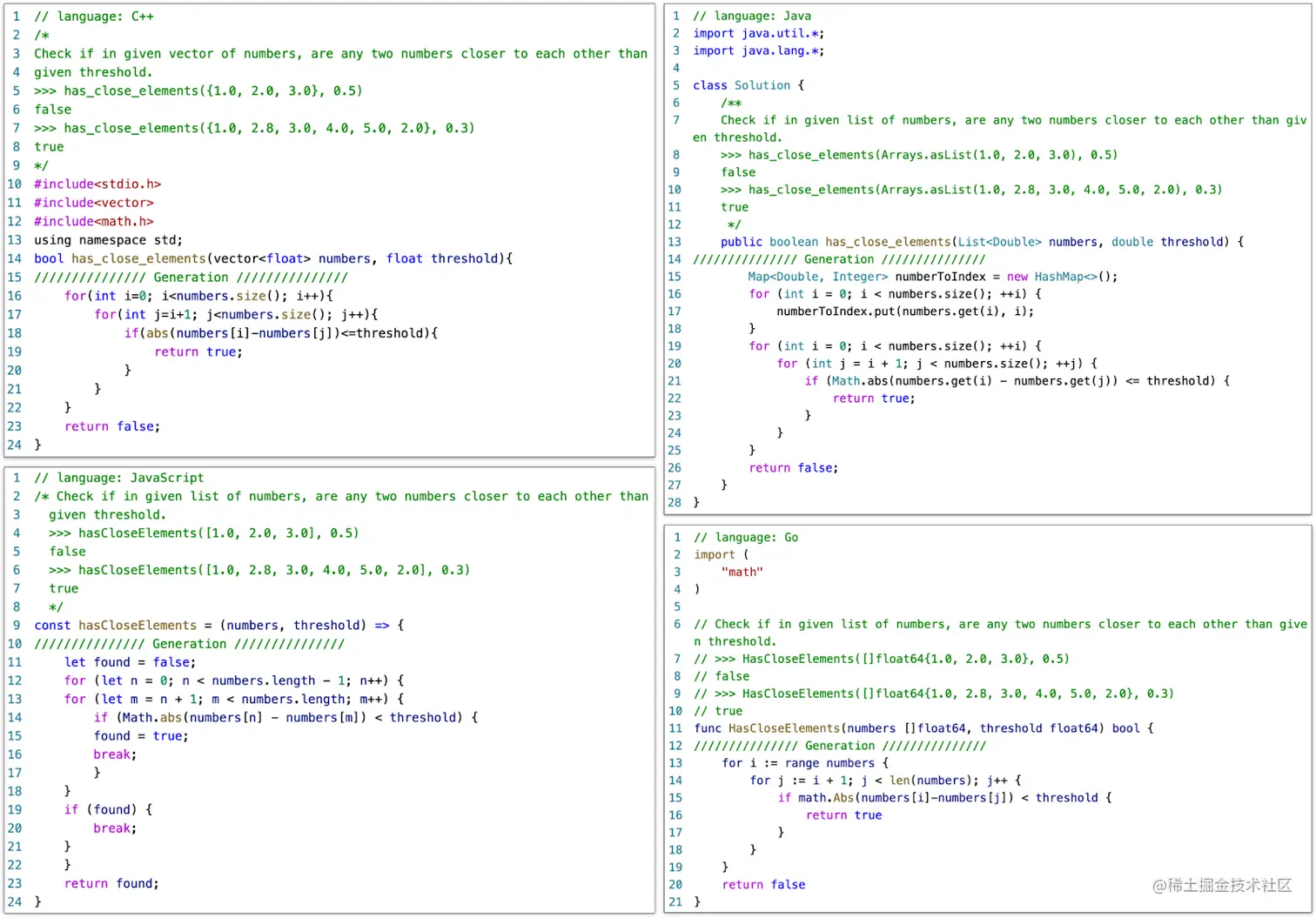 - Multilingual Code Generation: CodeGeeX has good performance for generating executable programs in several mainstream programming languages, including Python, C++, Java, JavaScript, Go, etc. DEMO