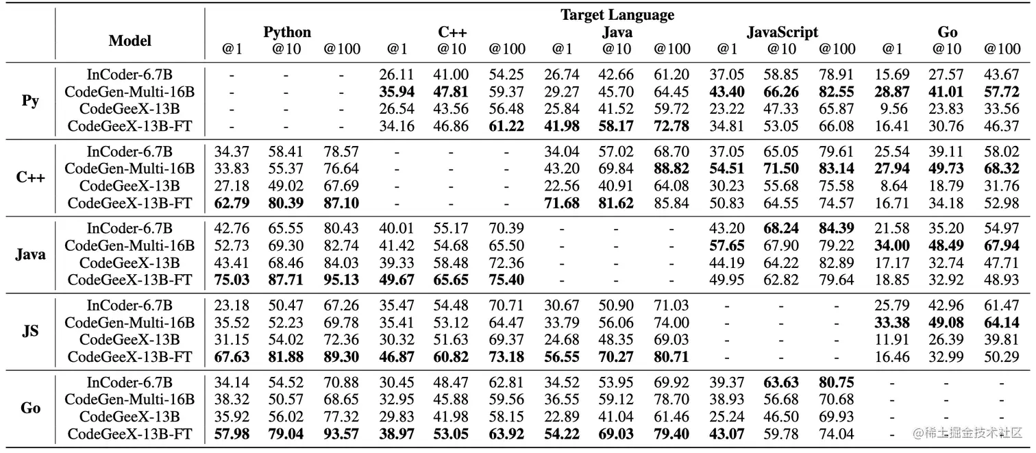 We also evaluate the performance of translation across different programming languages. We test the zero-shot performance of CodeGeeX, as well as the fine-tuned CodeGeeX-13B-FT (fine-tuned using the training set of code translation tasks in XLCoST[8:1]; Go is absent in the original set, we thus add a small set to it). The results indicate that models have a preference for languages, e.g., CodeGeeX is good at translating other languages to Python and C++, while CodeGen-Multi-16B is better at translating to JavaScript and Go; these could probably be due to the difference in language distribution in the training corpus. Among 20 translation pairs, we also observe that the performance of A-to-B and B-to-A are always negatively correlated, which might indicate that the current models are still not capable of learning all languages well.