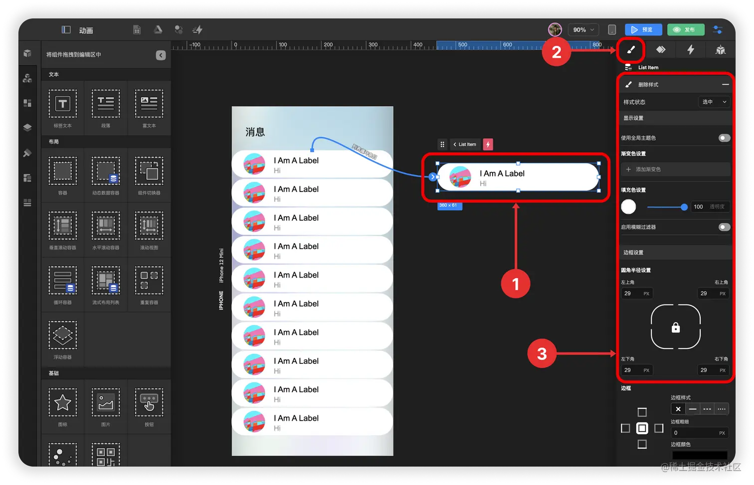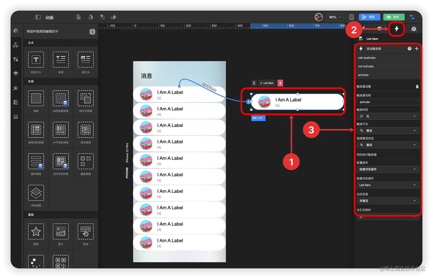如何实现消息条目选中变色? TOWIFY 2022-11-04 149 阅读1分钟 效果展示 前置准备 1.消息列表 具体步骤 1.配置点击样式 2.创建触发器 步骤分解 1.配置点击样式 1.1. 选中 循环条目 1.2. 点击 检查面板 中的 样式 1.3. 创建样式 1.4. 样式切换为 选中 2.创建触发器 2.1. 选中循环条目 2.2. 点击 检查面板 中的 触发器 2.3. 创建触发器 这样就可以实现消息条目选中变色了。