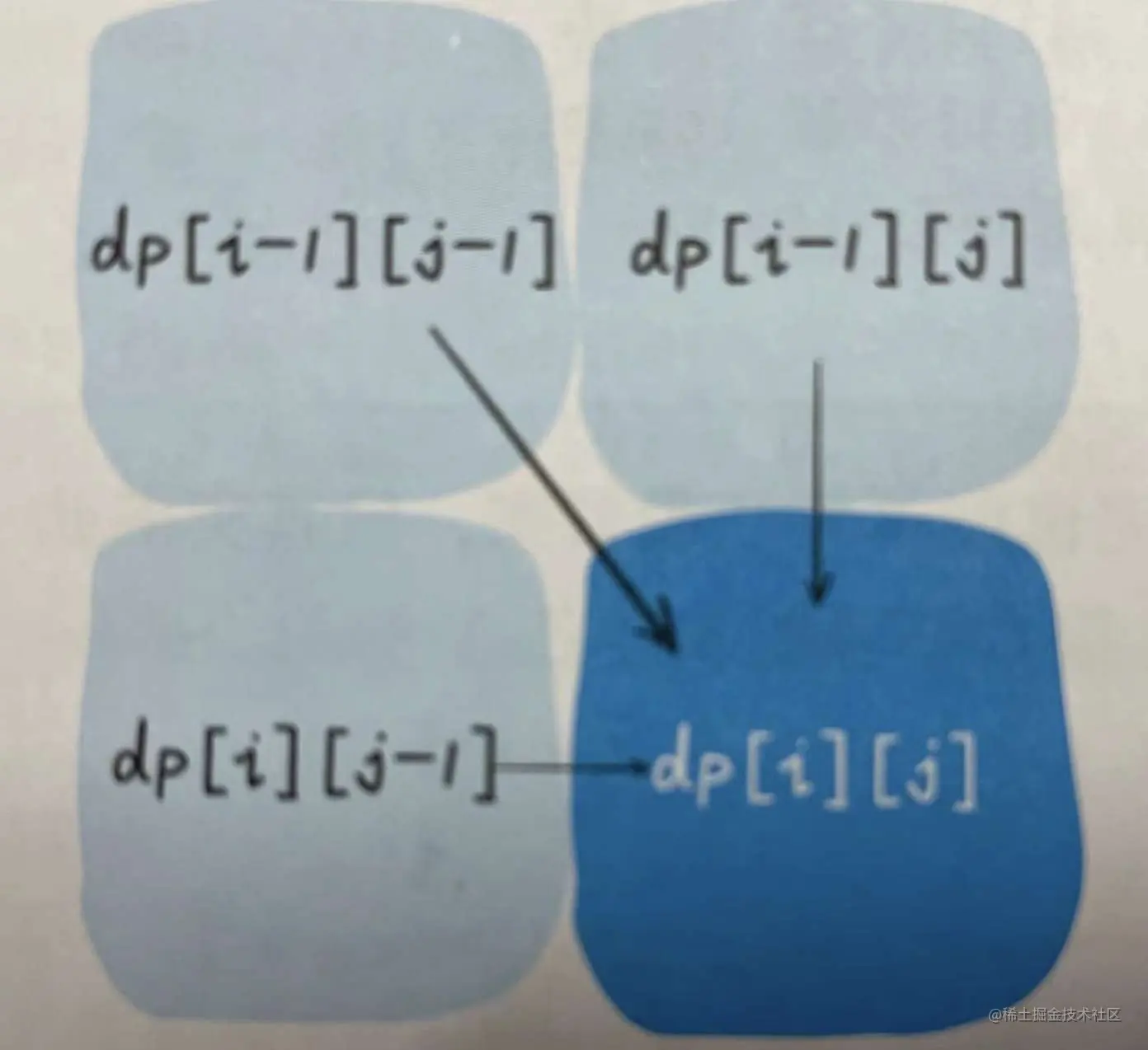 如果将二维数组dp看成一个表格,就可以用迭代的代码进行填充。根据状态转移方程,表格的
