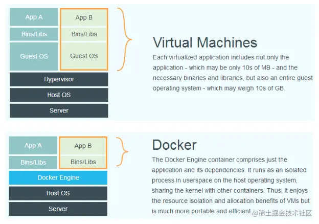 但是Docker使用的容器技术比虚拟机更加的轻便和快捷。容器内的应用进程直接运行于宿主的内核,容器内没有自己的内核,而且也没有进行硬件虚拟。因此容器要比传统虚拟机更为轻便,下图比较了两者的区别: